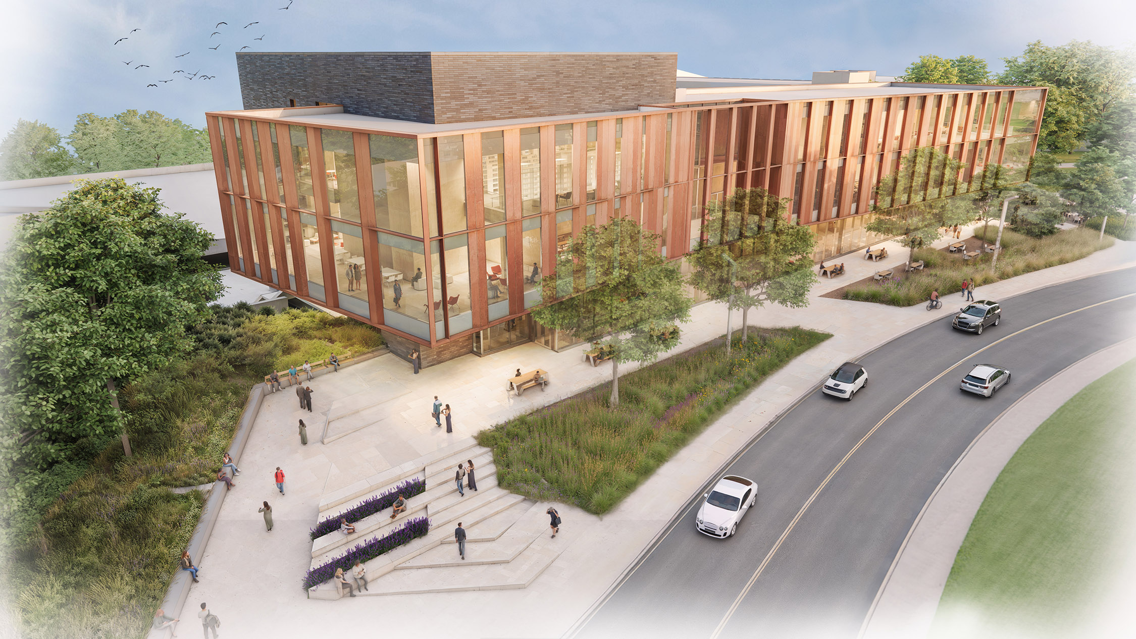 A new Gopher Way corridor will connect Learning and Environmental Sciences, the Gortner Ramp, and Ruttan Hall on a single accessible level. The surrounding landscape becomes a restorative outdoor extension of the building.