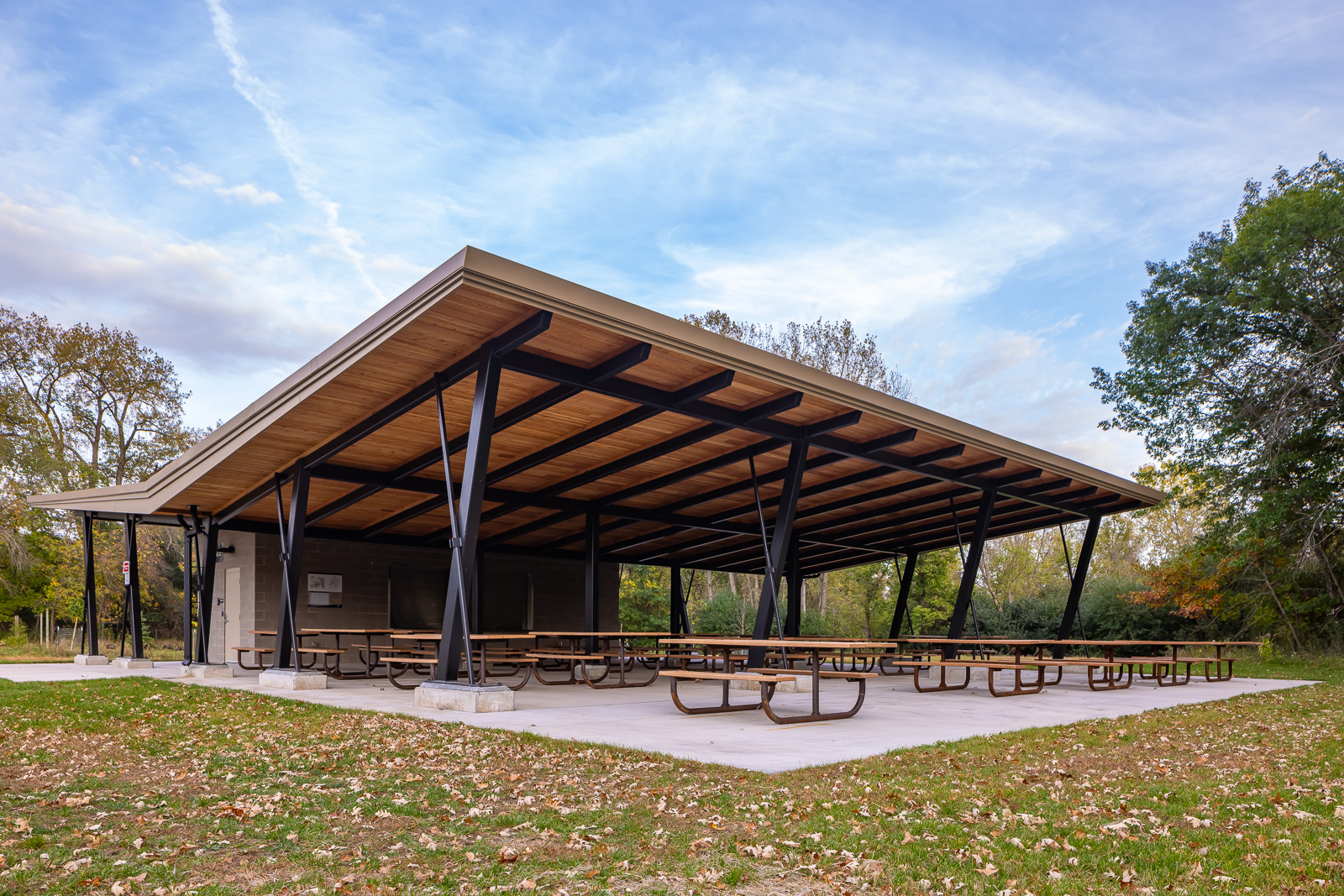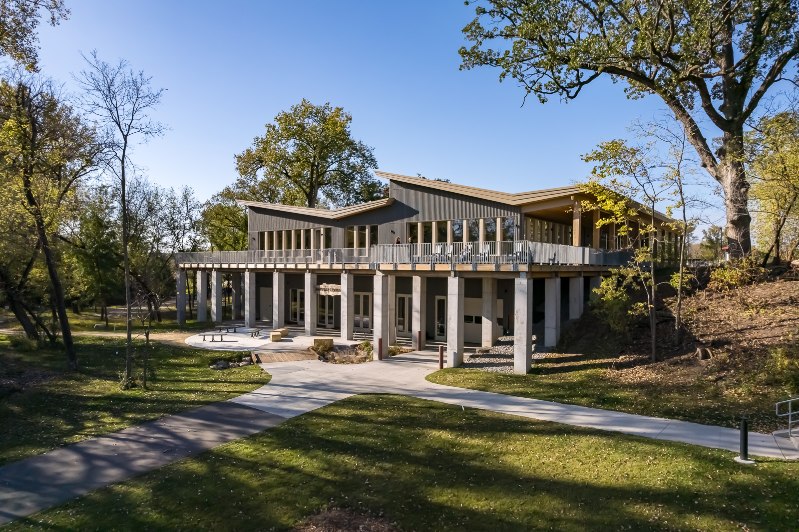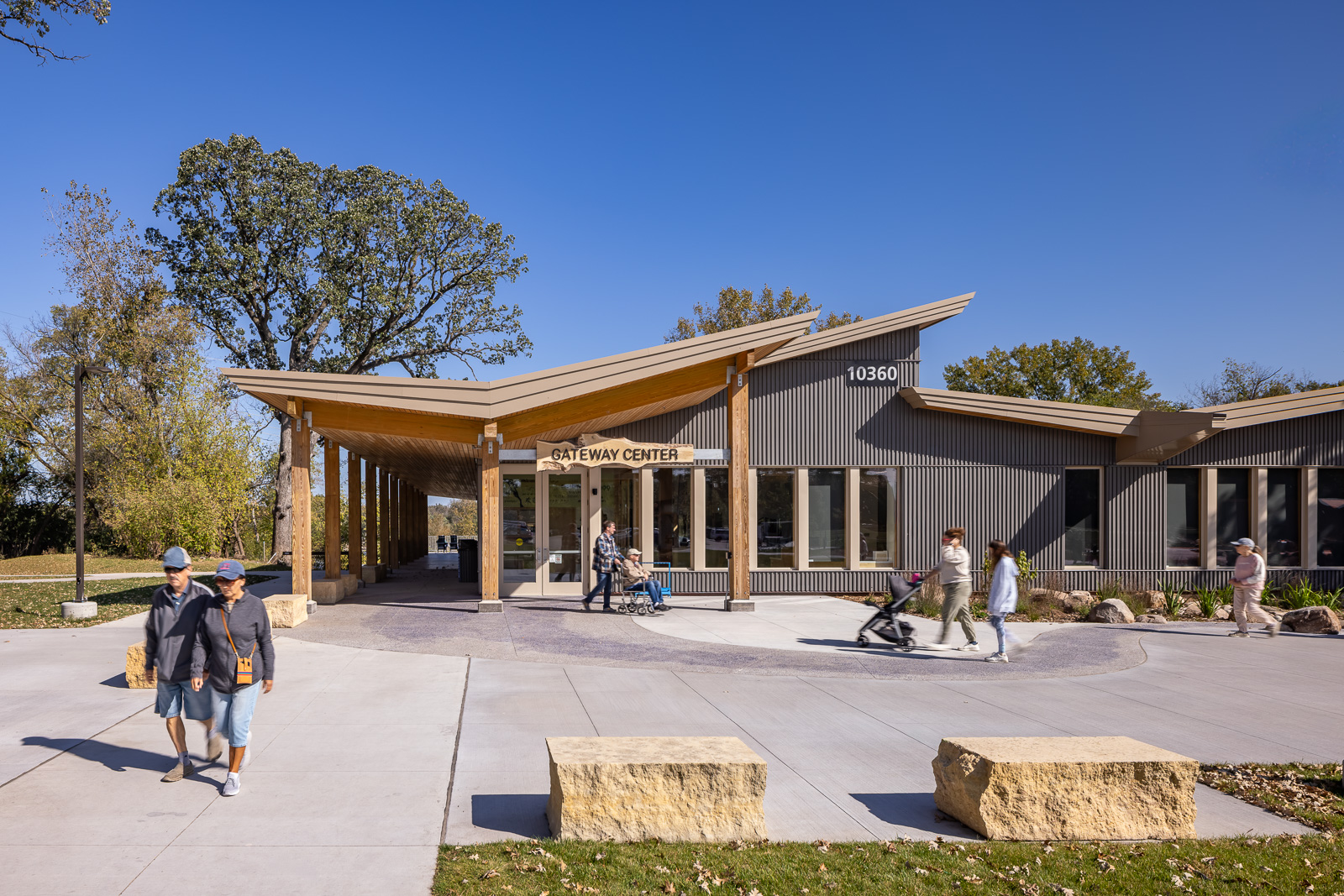 Mississippi Gateway Regional Park spans 160 acres along the scenic river valley and features more than two miles of hiking trails. Key elements include a new visitor center, picnic shelters, a maintenance facility, and seasonal restrooms. The project establishes a cohesive architectural language throughout the park, unifying indoor and outdoor spaces designed for learning, recreation, and community gathering.