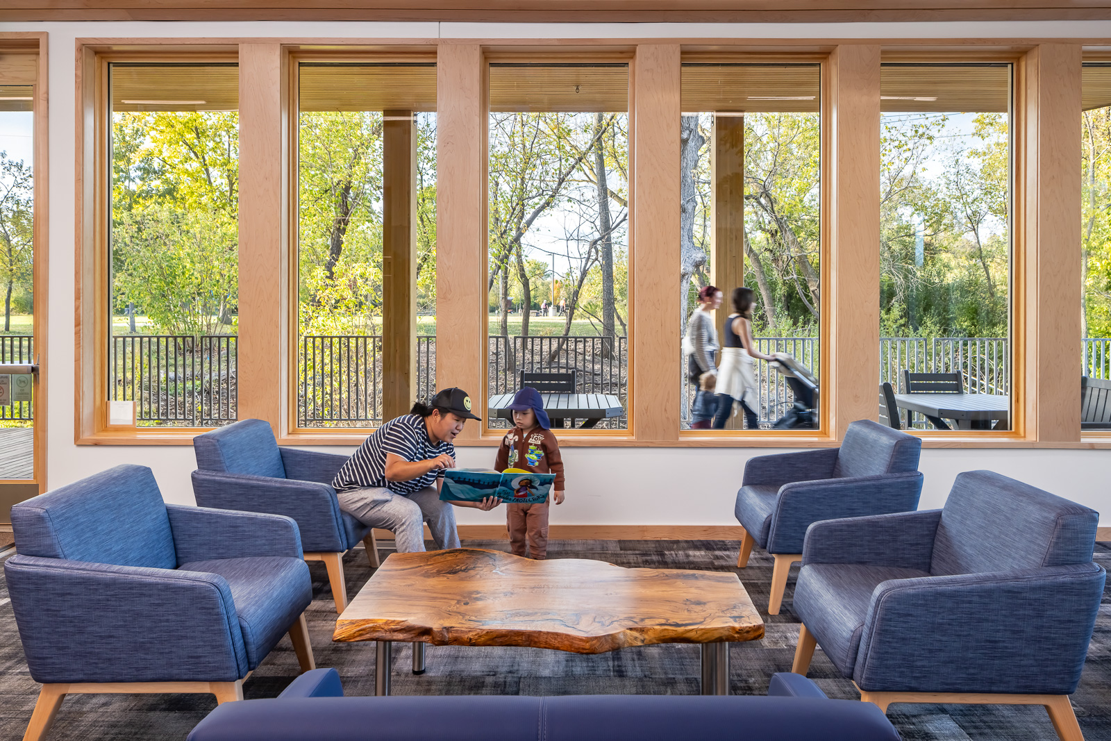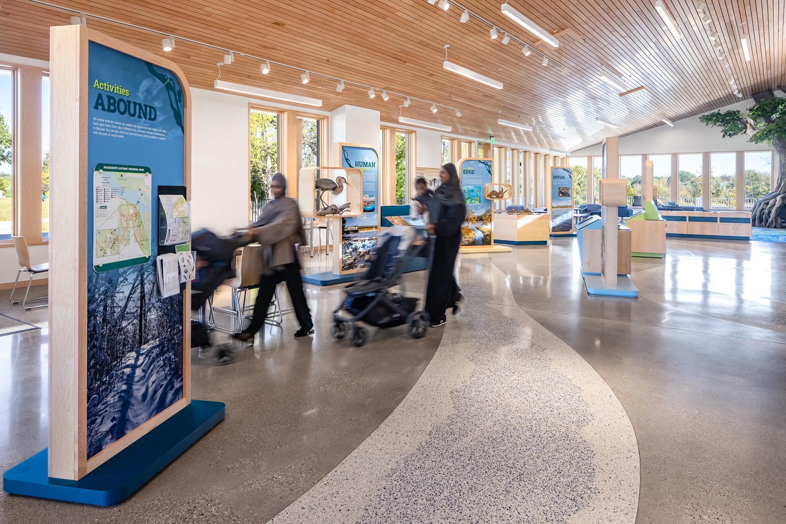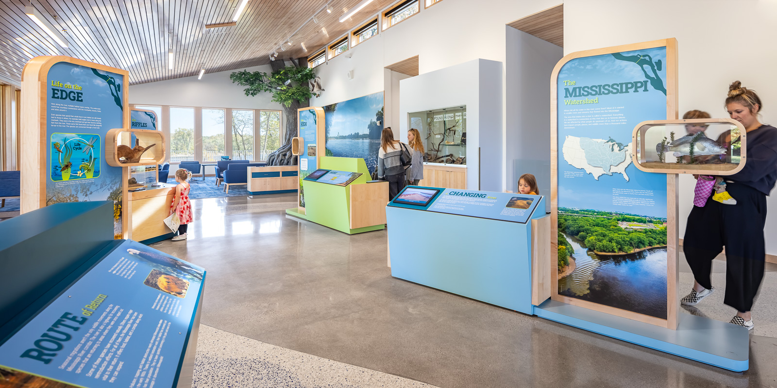 The largest gathering space is the 15,000-square-foot Gateway Center which houses classrooms and gathering spaces for the public, interactive exhibits, and office space for the Three Rivers Park District.