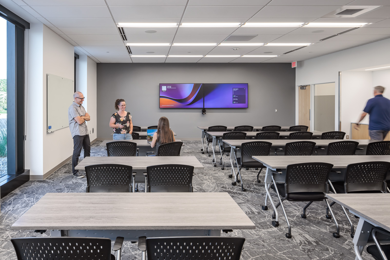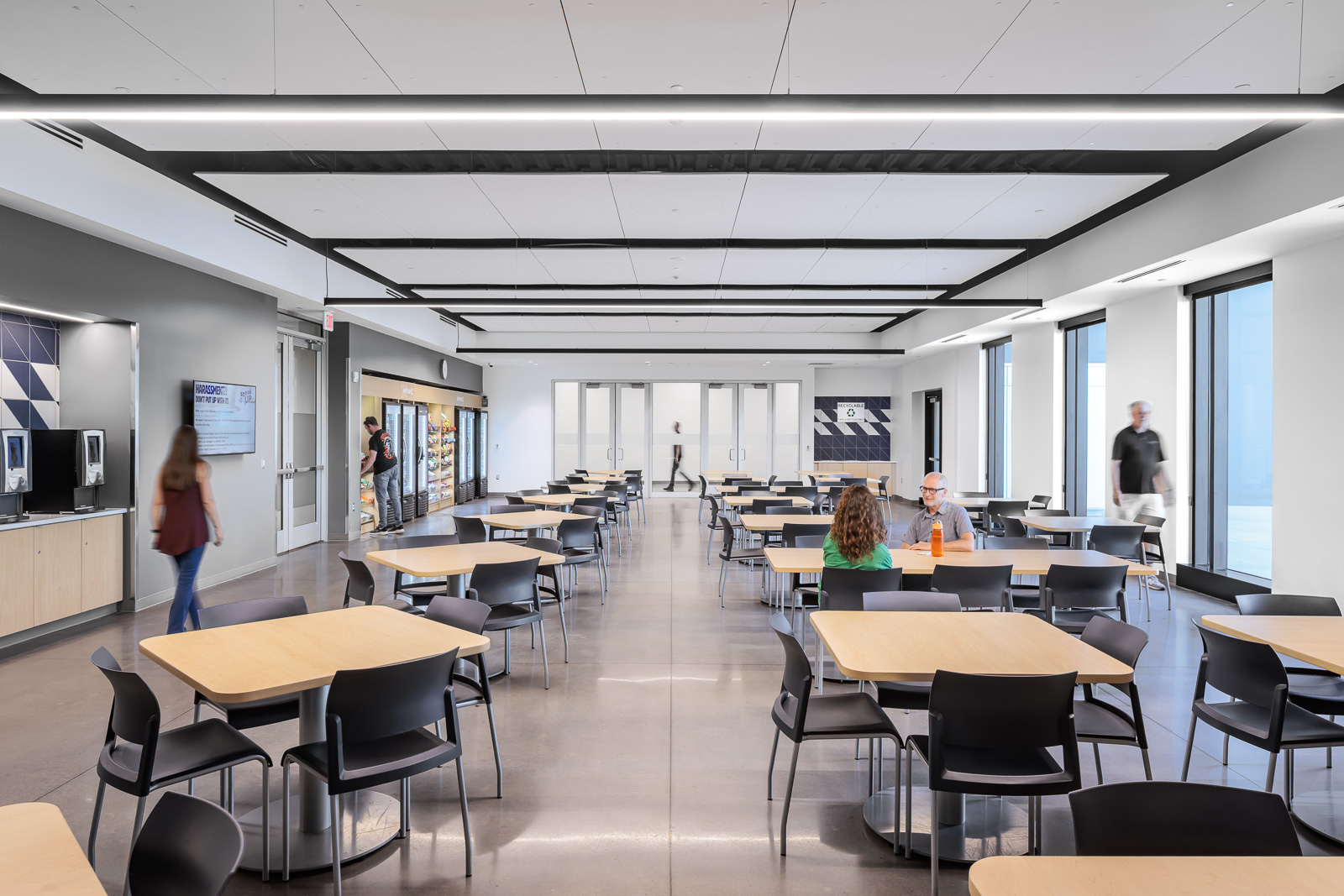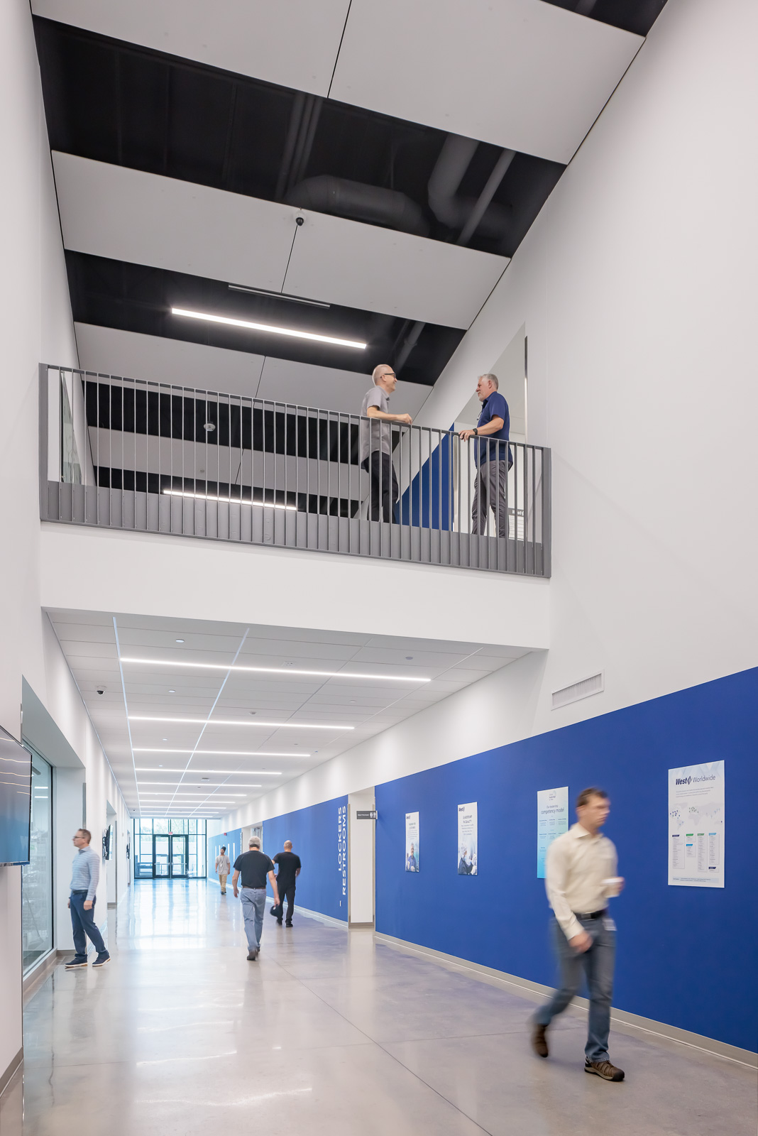 The office addition introduces much-needed amenities to the campus, including a new Town Hall for employee gatherings, meetings, and breaks. A “main street” connects the addition to the existing facility, creating a central hub for interaction. At the end of this walk on Level 2, the formal boardroom and presentation spaces provide a mezzanine area for informal guest hosting and flexible workspaces for visitors.