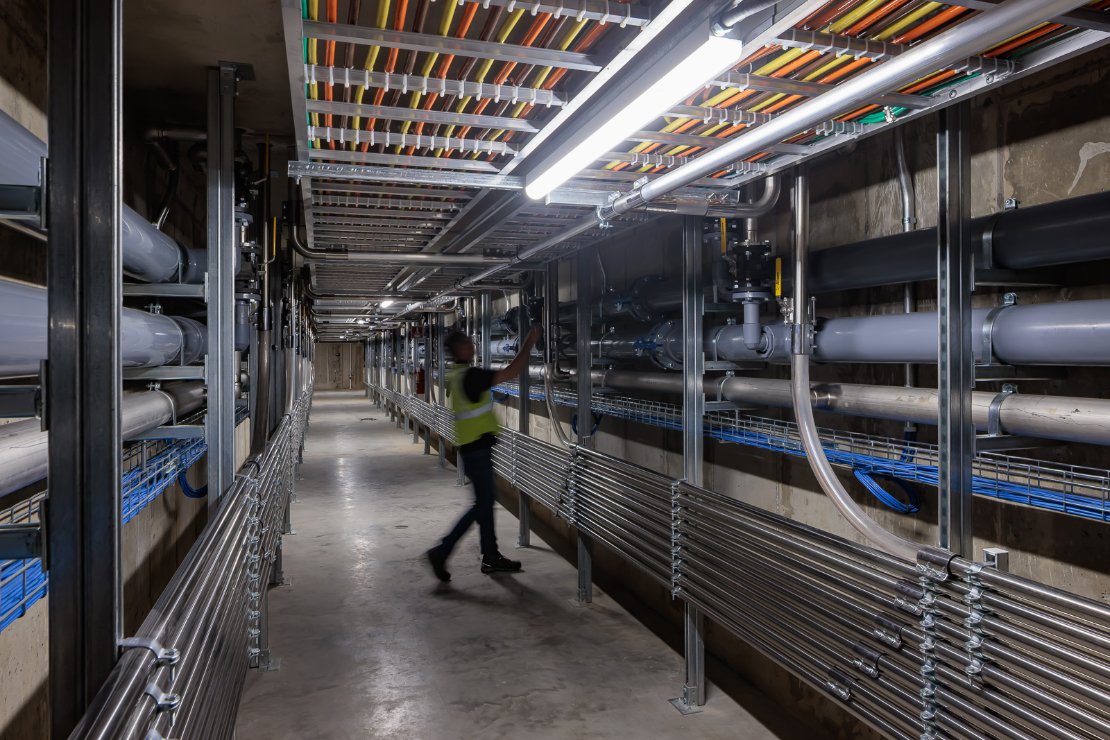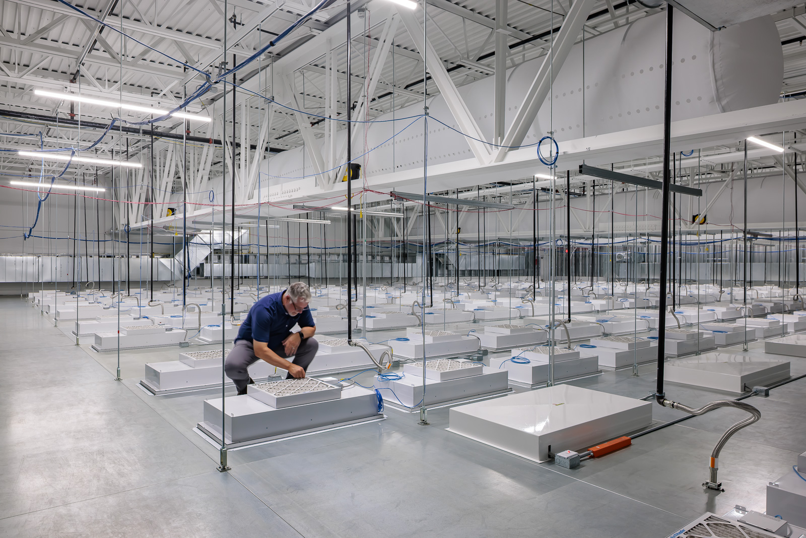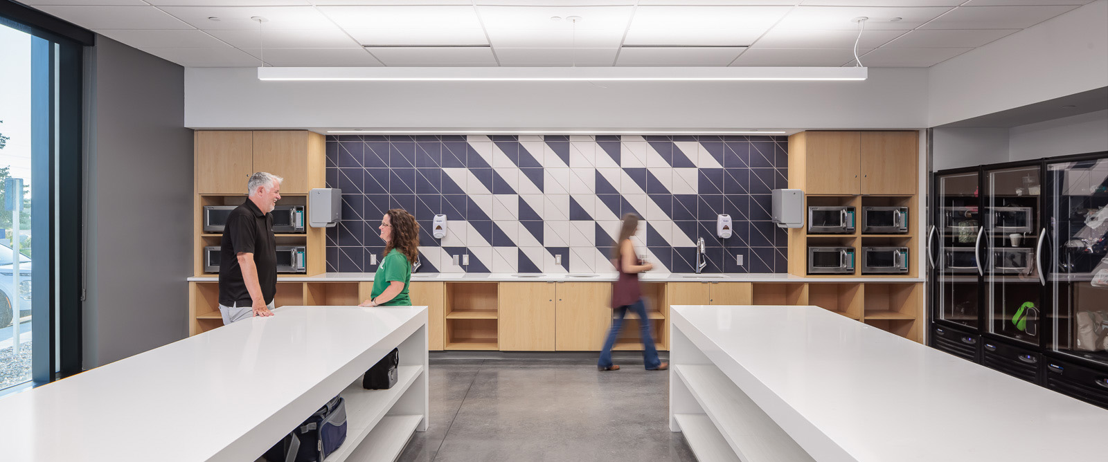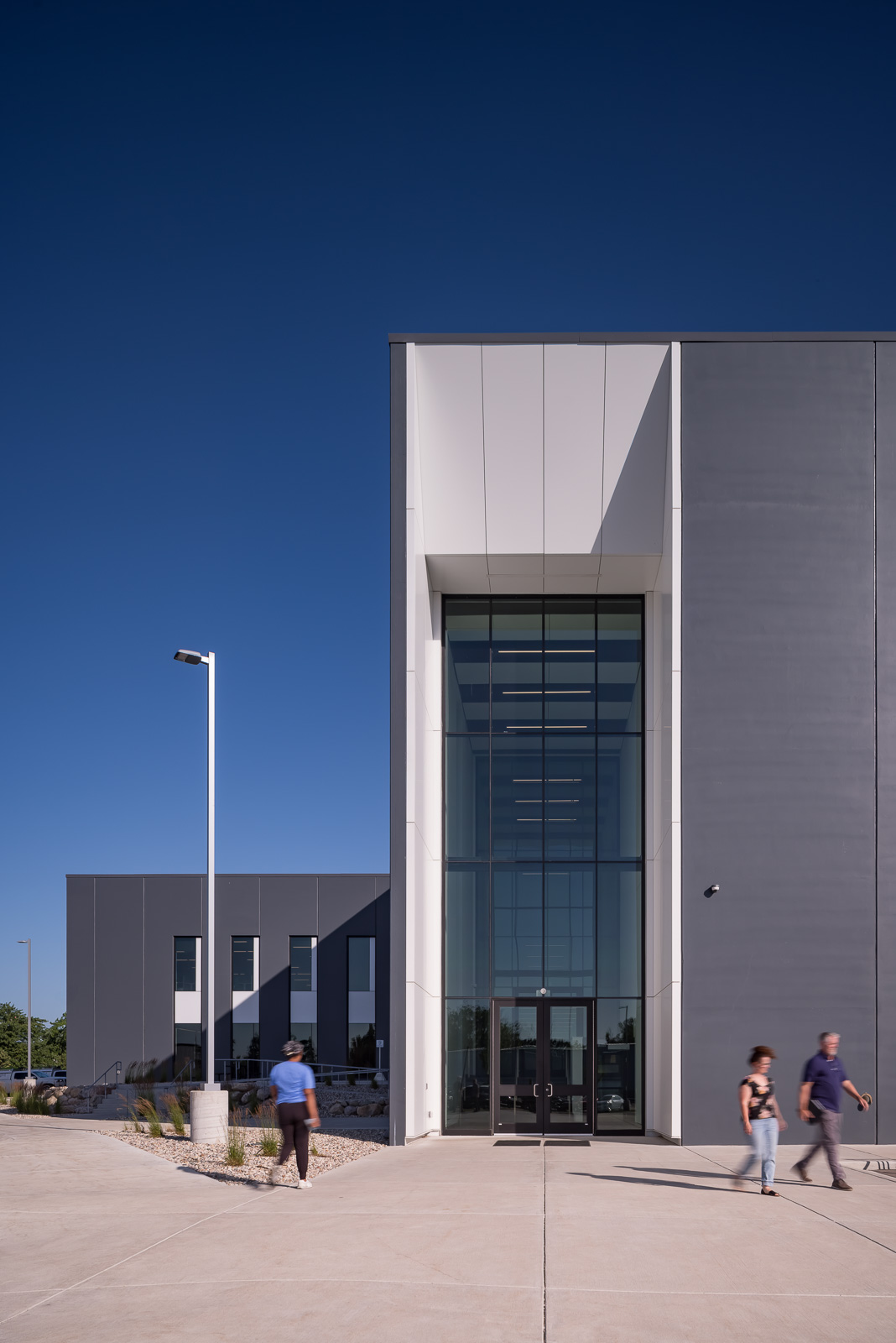 The office addition introduces much-needed amenities to the campus, including a new Town Hall for employee gatherings, meetings, and breaks. A “main street” connects the addition to the existing facility, creating a central hub for interaction. At the end of this walk on Level 2, the formal boardroom and presentation spaces provide a mezzanine area for informal guest hosting and flexible workspaces for visitors.
